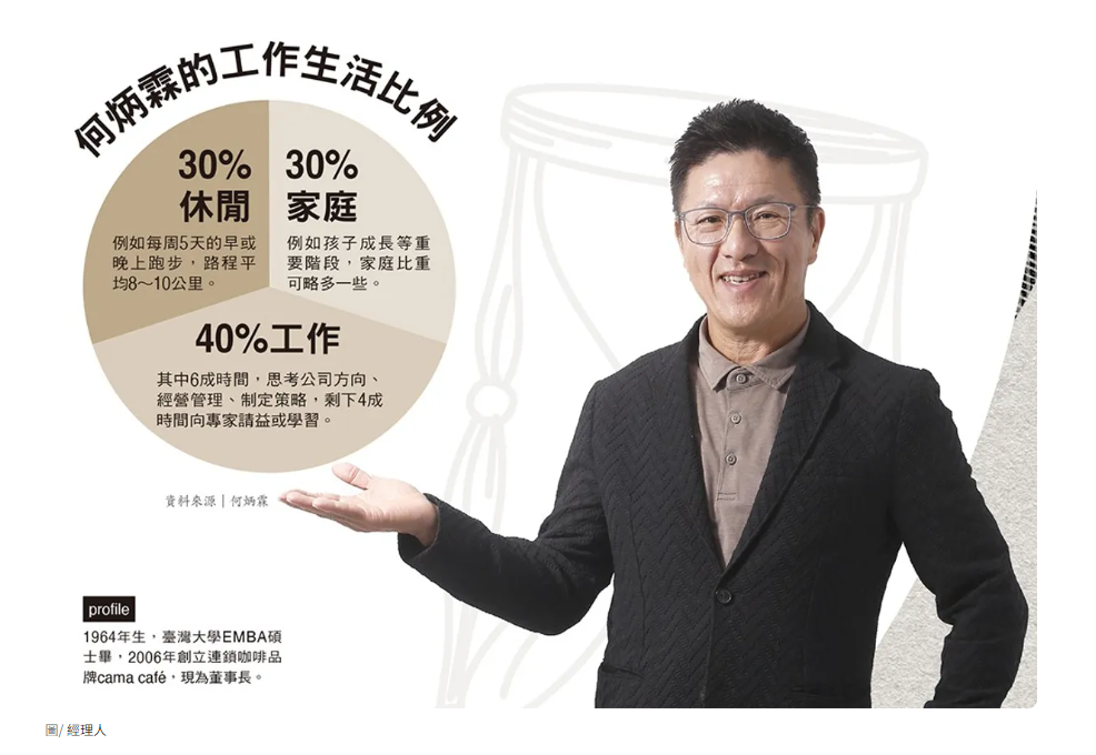 為什麼把學習的時間看得這麼重要?何炳霖說,自己 2020 年從臺大 EMBA 畢業、2022 年接任臺大 EMBA 商學校友會會長後,就發現自己的人脈圈拓寬了,「和他們約吃飯、請益問題,以前根本不會有這些資源。」何炳霖的經驗顯示,時間管理不只是找到工作和休閒之間的平衡,而是把時間花在對的地方。
