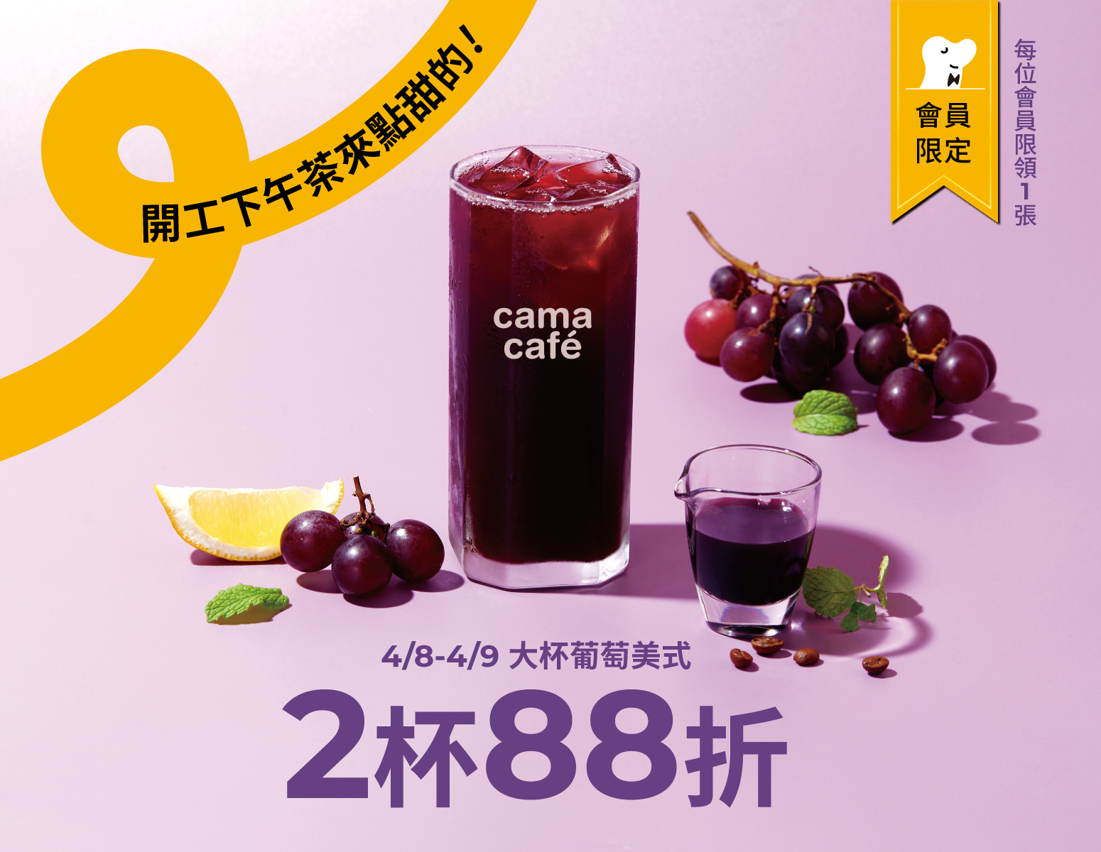 四天連假結束後,開工來點甜甜下午茶一掃工作煩惱!4月8日至4月9日連續兩天,於cama café門市購買大杯葡萄風味美式,享2杯88折優惠。只要使用手機註冊cama 會員APP並登入,不限資格即可領取該優惠券。收假開工別憂鬱,與好同事一起來cama café享受專業又美味的好咖啡吧!