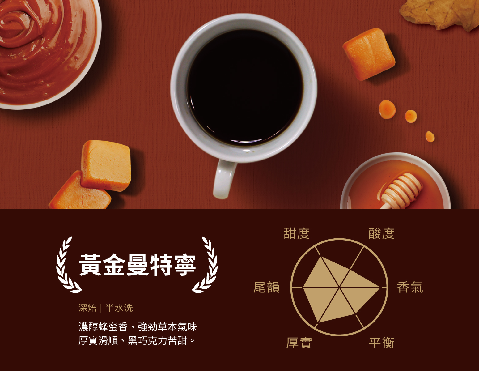 來自印尼的「黃金曼特寧」多年來享譽盛名,其獨特的草本氣息與厚實的蜂蜜、黑巧克力苦甜香,都是刻印在消費者腦中的經典風味。純手工採收加上當地特有的自然蔭乾法,進一步創造細緻豐富的口感,將強勁與優雅集於一杯。